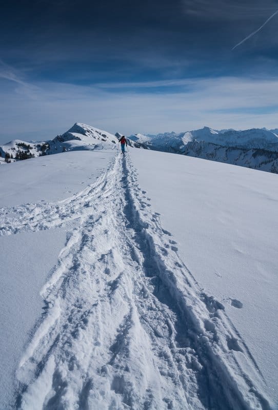 Für alle, die ein Stück mehr möchten: Der Aufstieg erfolgt über breite, verschneite Hänge, bis du in der Höhe die Ruhe der Berge spürst. Mit Blick über den Arlberg und die Gipfel des Bregenzerwaldes ist diese Tour ein echtes Winterhighlight.